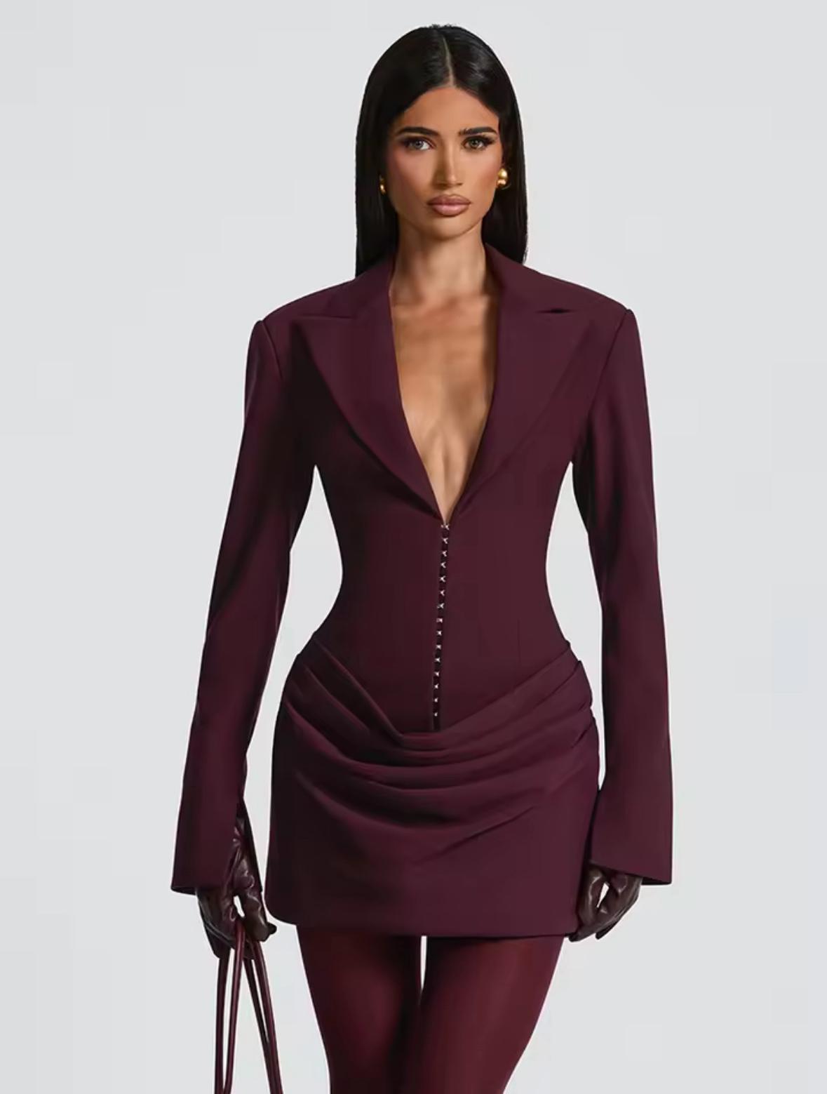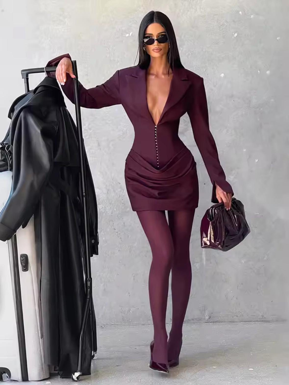 שמלת מיני בורדו עם צווארון V,כפתורים נסתריים ושרוולים ארוכים – אלגנטית ומושלמת למסיבות וערבים מיוחדים.