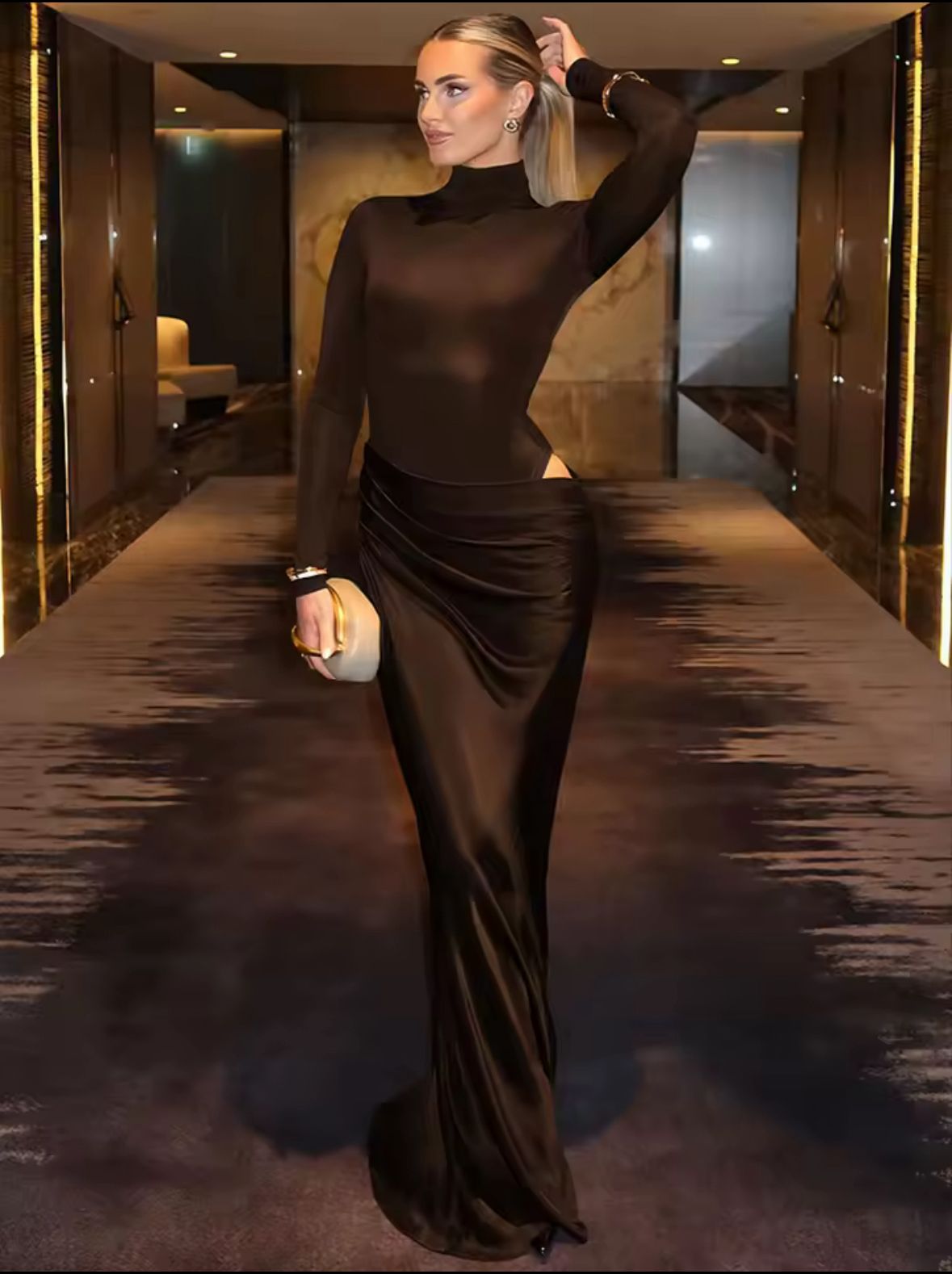 שמלת מקסי אדומה מחמיאה לגוף עם עיצוב קפלים, פתחים עדינים וצווארון גבוה – מושלמת לערבים נוצצים ולמראה סקסי ואלגנטי