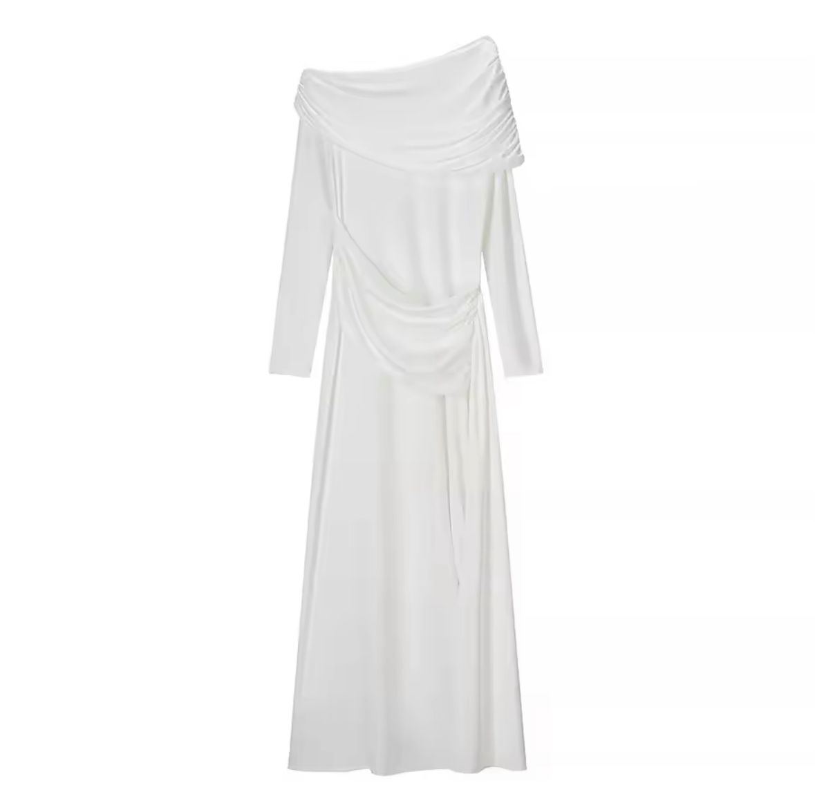 שמלת ערב נשית ארוכה עד הקרסול, בגזרת מחטב אלגנטית עם מותן מוגבה, שרוולים ארוכים ועיצוב עדין