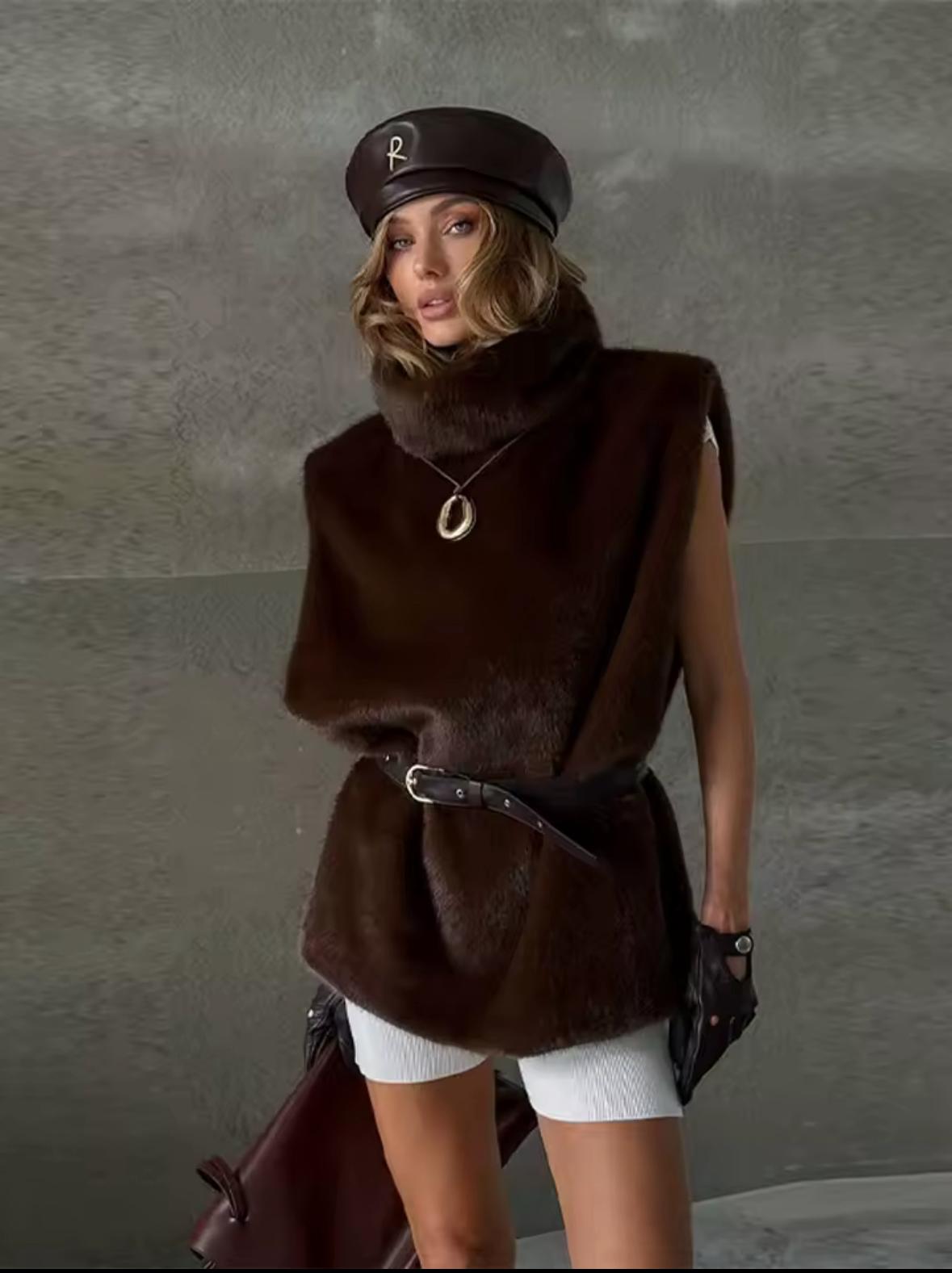 וסט פרווה חומה לנשים, צווארון גבוה, ללא שרוולים