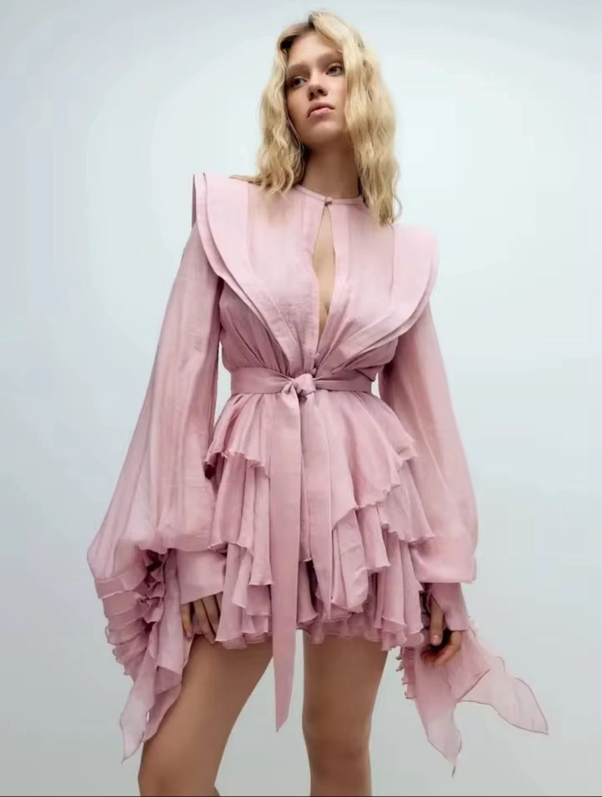 שמלת מיני ורודה רומנטית עם עיטורי נפנוף עדינים, צווארון O אלגנטי, שרוולים מניפתיים ארוכים ומערכת שרוכים מעודנת – עיצוב שיקי ויוקרתי לכל אירוע מיוחד.